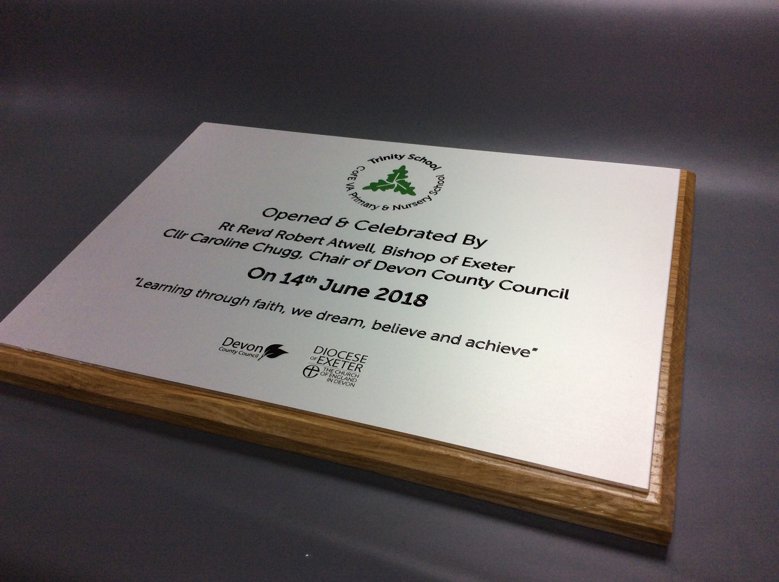 Manufactured from finest anodised aluminium. Your plaque can optionally be mounted onto solid light oak, which can then be stained to your bespoke requirements.